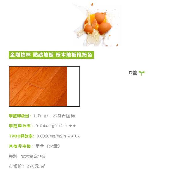 留意,甲醛釋放量1.7mg/L,不契合E1類(≤1.5 mg/L)規范。這是26款木地板中,獨逐一款連國標都沒經過的。